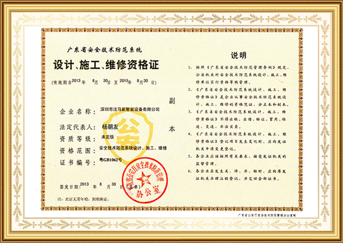 廣東省安全技術(shù)防范系統(tǒng)設(shè)計(jì)施工資格證