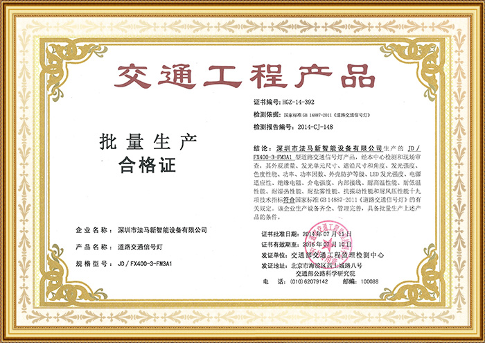 交通工程產(chǎn)品批量生產(chǎn)合格證