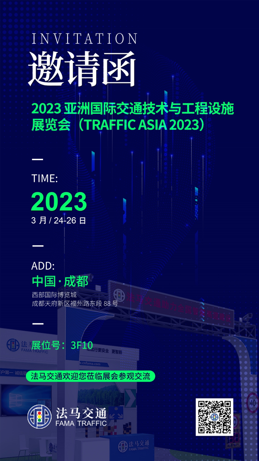 2023年亞洲國際交通技術(shù)與工程設(shè)施展覽會(huì)( TRAFFIC ASIA 2023 )將于3月24日-26日在(成都)西部國際博覽城舉辦,本屆展會(huì)以“新技術(shù)、新動(dòng)能、新格局”為主題。作為一家集產(chǎn)品設(shè)計(jì)、研發(fā)、生產(chǎn)、銷售和服務(wù)于一體的智慧交通解決方案供應(yīng)商,法馬交通受邀出席本次展會(huì)。