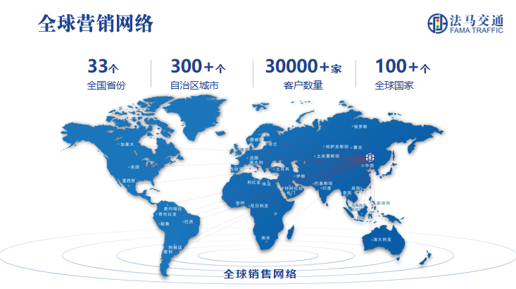 作為一家專注智慧交通整體解決方案提供商及服務(wù)商,法馬交通集設(shè)計(jì)、研發(fā)、生產(chǎn)、銷售、服務(wù)于一體,致力于智慧交通建設(shè),產(chǎn)品覆蓋智能信號(hào)控制機(jī)系列、智能LED交通燈系列、智能信號(hào)標(biāo)志系列和智能多功能燈桿系列。目前,法馬交通業(yè)務(wù)遍布全國(guó)33個(gè)省、直轄市和自治區(qū),涉及300多個(gè)城市,擁有數(shù)萬(wàn)家用戶;海外業(yè)務(wù)市場(chǎng)覆蓋150多個(gè)國(guó)家,超過(guò)近20000個(gè)交通工程,為市場(chǎng)提供一站式智能交通解決方案。