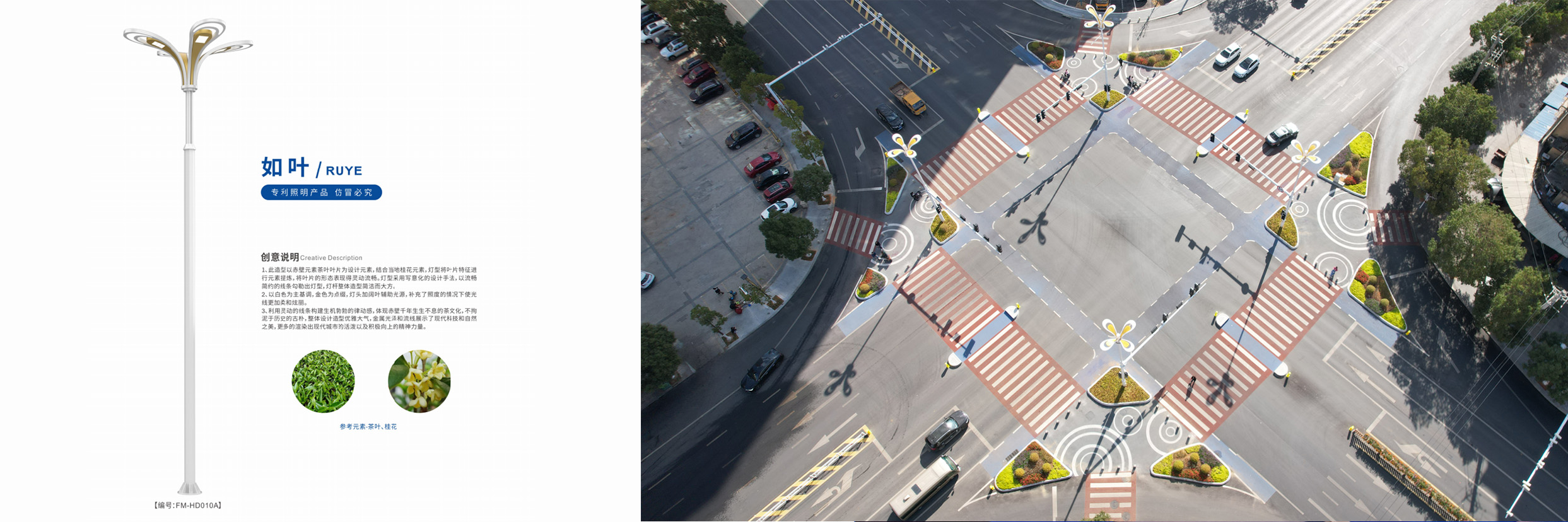 這款設(shè)計巧妙融合了赤壁地區(qū)的茶葉葉片與桂花元素,通過抽象化的藝術(shù)處理,將自然靈感轉(zhuǎn)化為靈動流暢的現(xiàn)代燈桿造型。白色主體配以金色點綴,輔以闊葉形光源,既保證了照明效果,又營造出柔和而炫麗的視覺體驗。