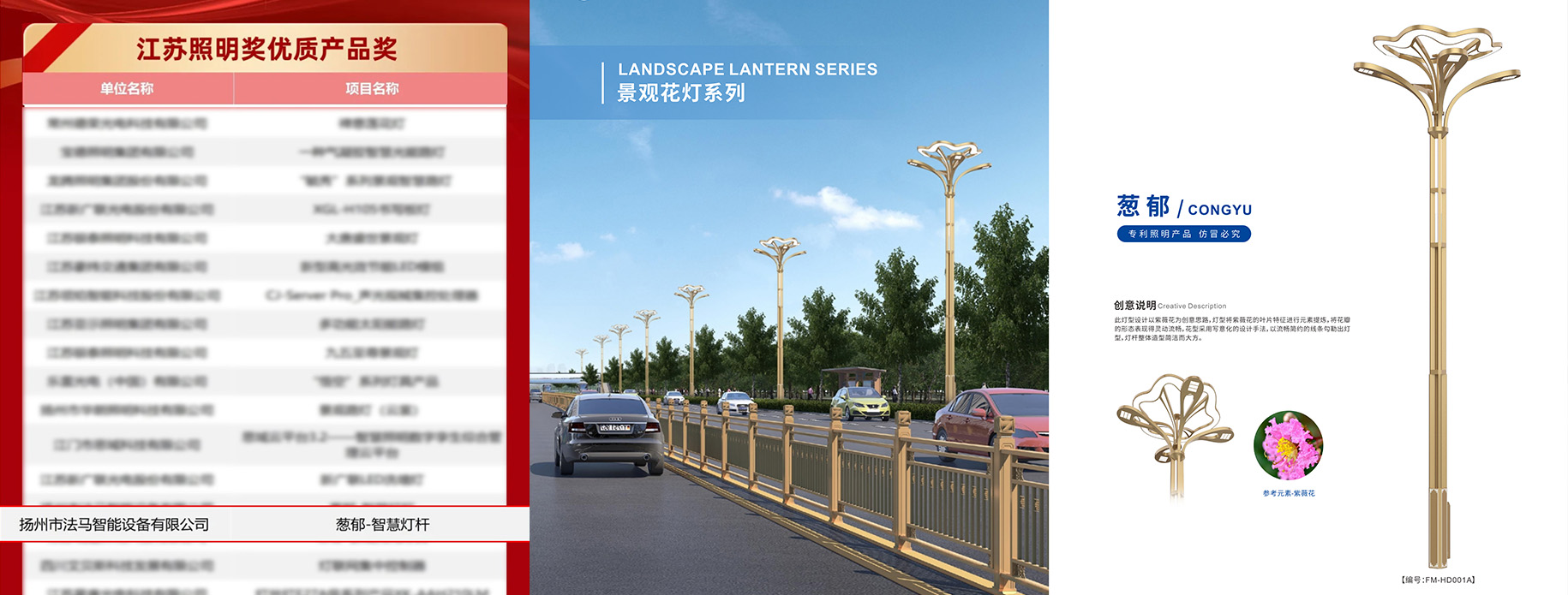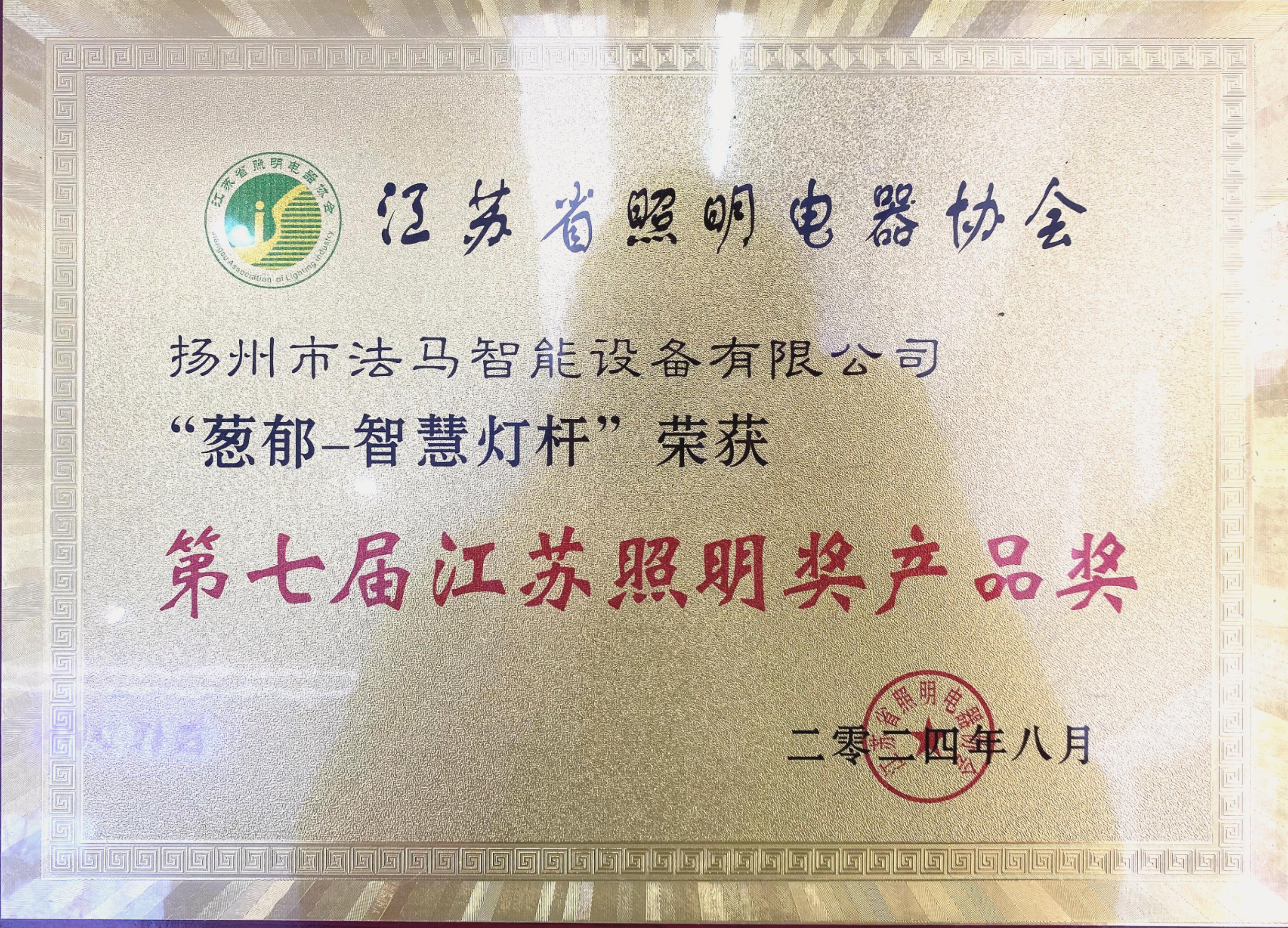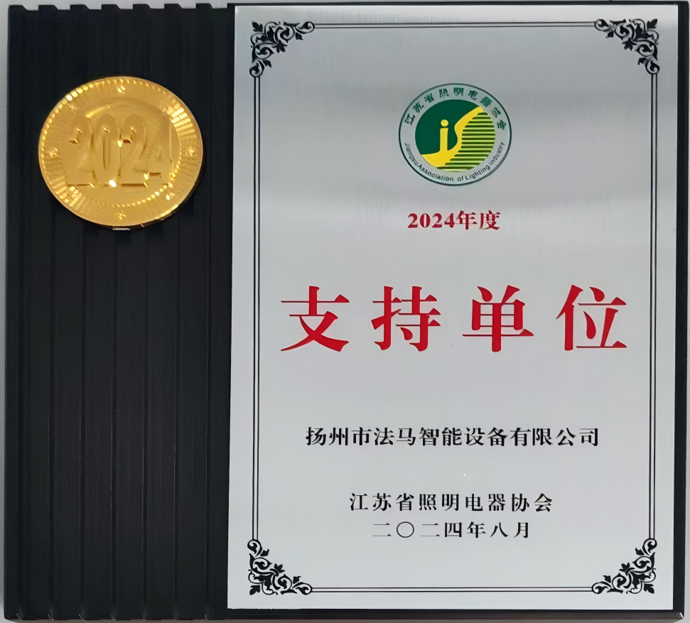 法馬交通憑借其創(chuàng)新的蔥郁智慧燈桿,在第七屆江蘇照明獎(jiǎng)中榮獲優(yōu)質(zhì)產(chǎn)品獎(jiǎng),并在頒獎(jiǎng)現(xiàn)場(chǎng)同時(shí)榮獲了江蘇省照明電器協(xié)會(huì)頒發(fā)的2024年度支持單位榮譽(yù)。