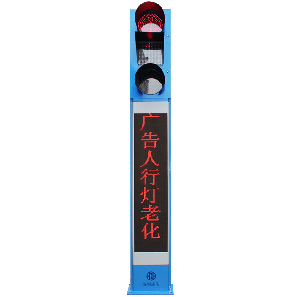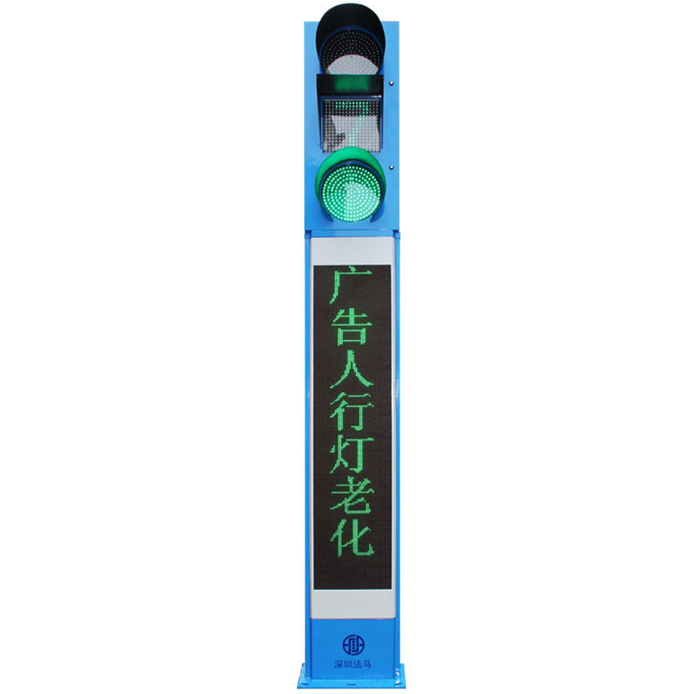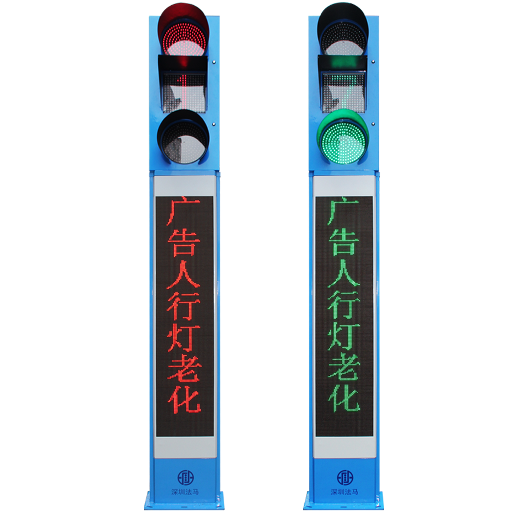 一體式廣告人行燈由機(jī)動信號燈、LED顯示屏、廣告吸塑燈箱、顯示屏控制卡、箱體組成