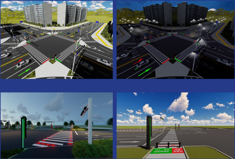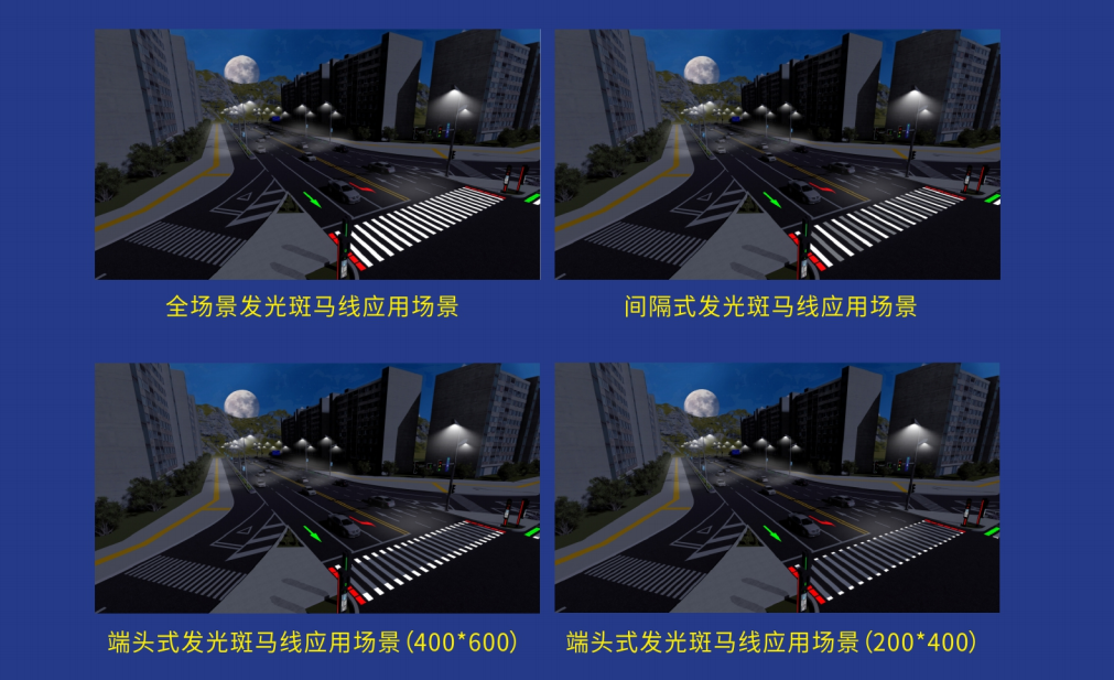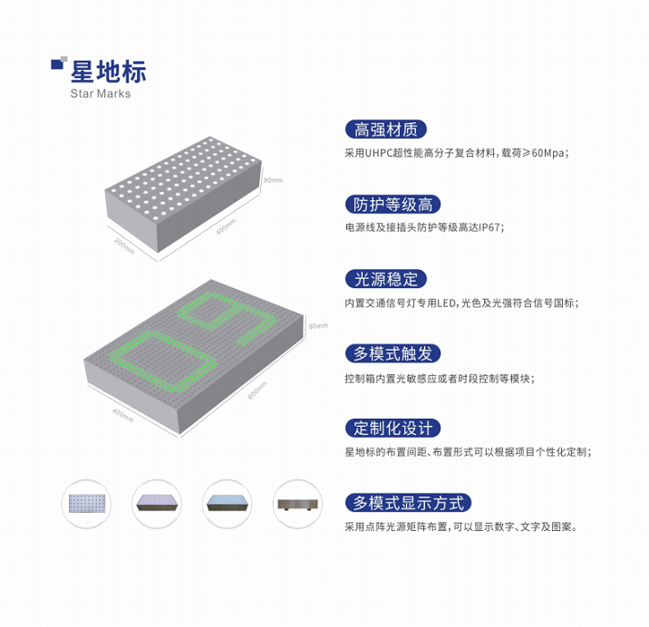 不僅在信號(hào)燈、語音以及圖像對(duì)行人進(jìn)行提醒和警示,同時(shí)方案中的星地標(biāo)采用點(diǎn)陣燈珠排布,可同步顯示行人倒計(jì)時(shí)或顯示文明標(biāo)語,在亮化了斑馬線為駕駛員提供好的視線的同時(shí),又有效地為低頭族等行為人員給予提醒與警示