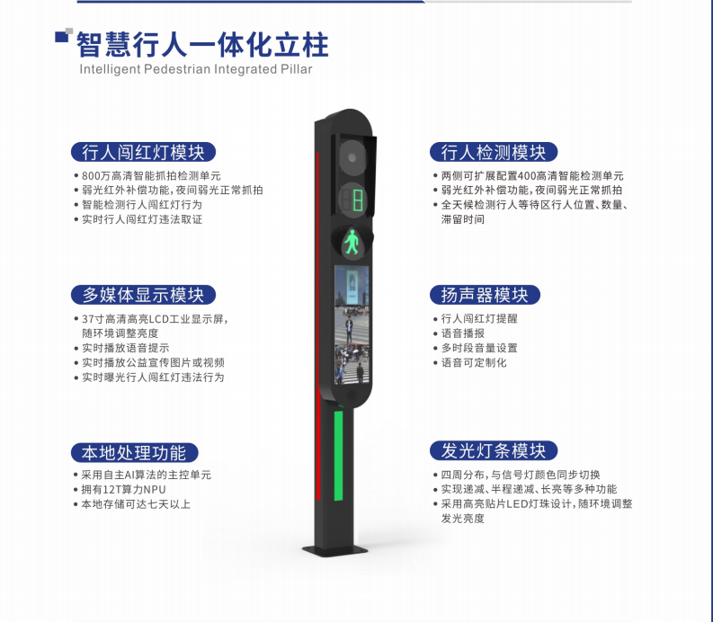 智慧行人過街管控提升方案,通過在斑馬線設(shè)置行人闖紅燈抓拍功能、語音播報(bào)提醒、LCD屏曝光等手段,對(duì)行人闖紅燈進(jìn)行治理工作,解決行人闖紅燈問題,以及沒有對(duì)盲人過街進(jìn)行有效指示問題,減少斑馬線事故
