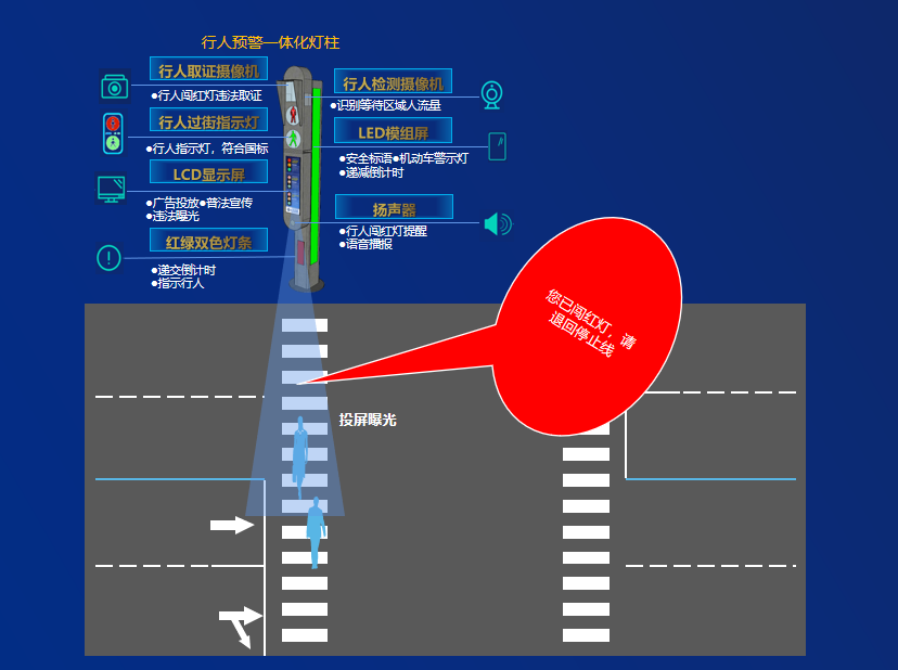 紅綠燈檢測(cè)器感知紅綠燈狀態(tài)、檢測(cè)相機(jī)抓拍行人闖紅燈行為、曝光屏曝光、語(yǔ)音喊話