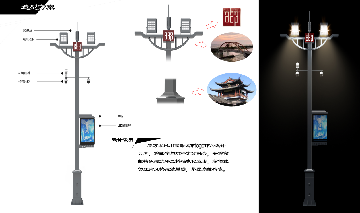 本方案采用高郵城市l(wèi)ogo作為設(shè)計(jì)元素,將郵字與燈桿充分融合,并將高郵特色建筑物二橋抽象化表現(xiàn),箱體效仿江南風(fēng)格建筑屋檐,盡顯高郵特色。