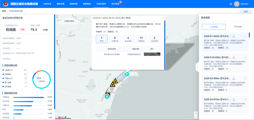 依照國(guó)家行業(yè)相關(guān)標(biāo)準(zhǔn)規(guī)范,建立標(biāo)準(zhǔn)化、精準(zhǔn)化的排查流程及方法,對(duì)道路隱患依次排查。通過(guò)可視化、數(shù)據(jù)看板等手段再現(xiàn)道路隱患點(diǎn)位的既往數(shù)據(jù)、現(xiàn)在實(shí)際情況以及整改后的效果。